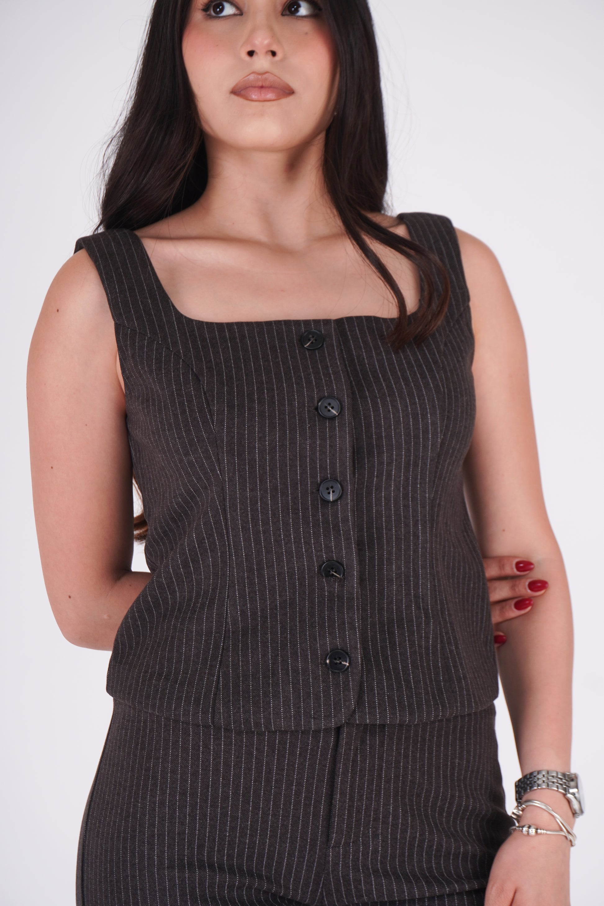 Chaleco de corte entallado confeccionado en un tejido con trama de hilo metalizado. Diseño con escote cuadrado, tirantes anchos y cierre frontal mediante botones forrados a tono.