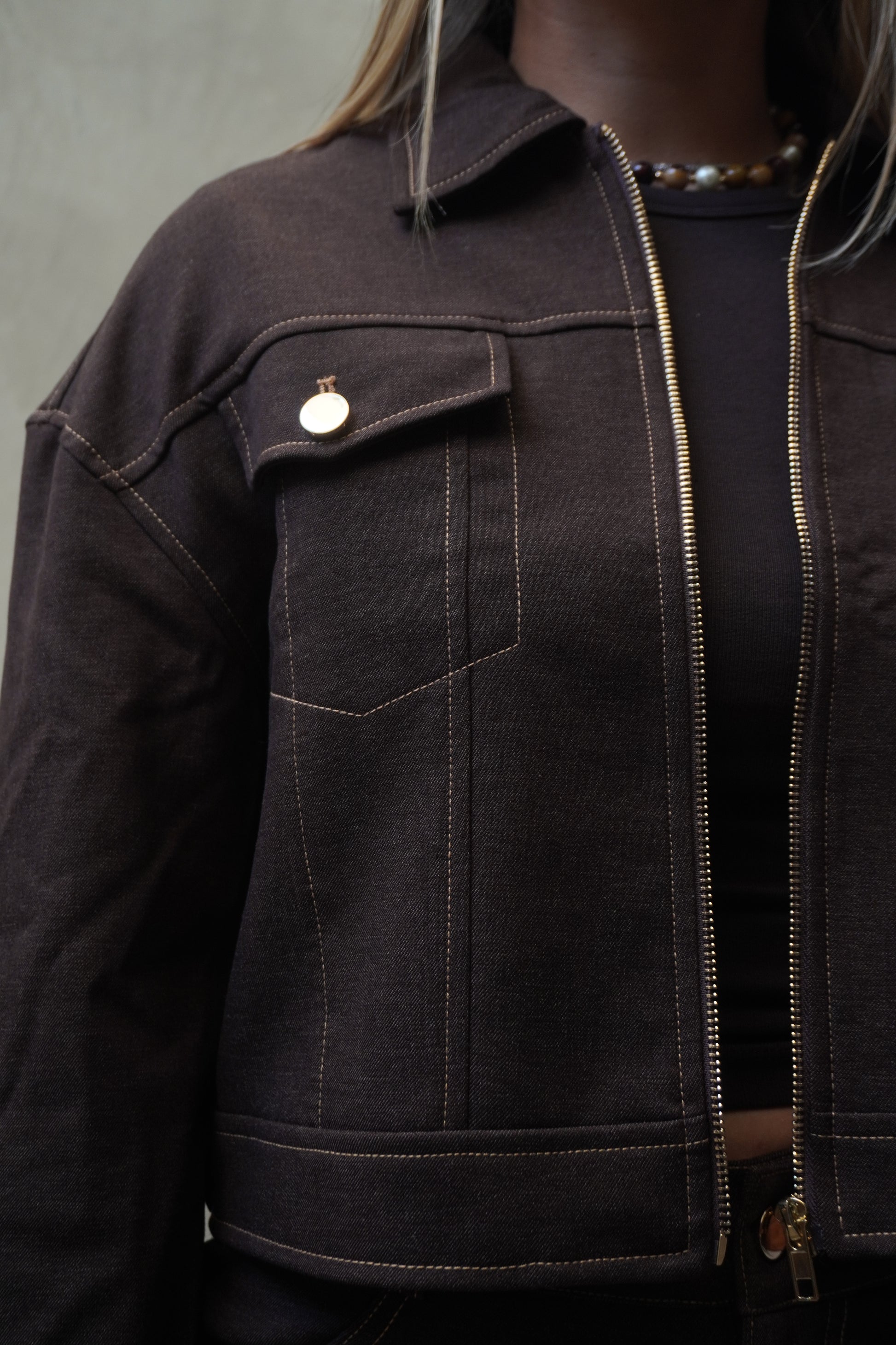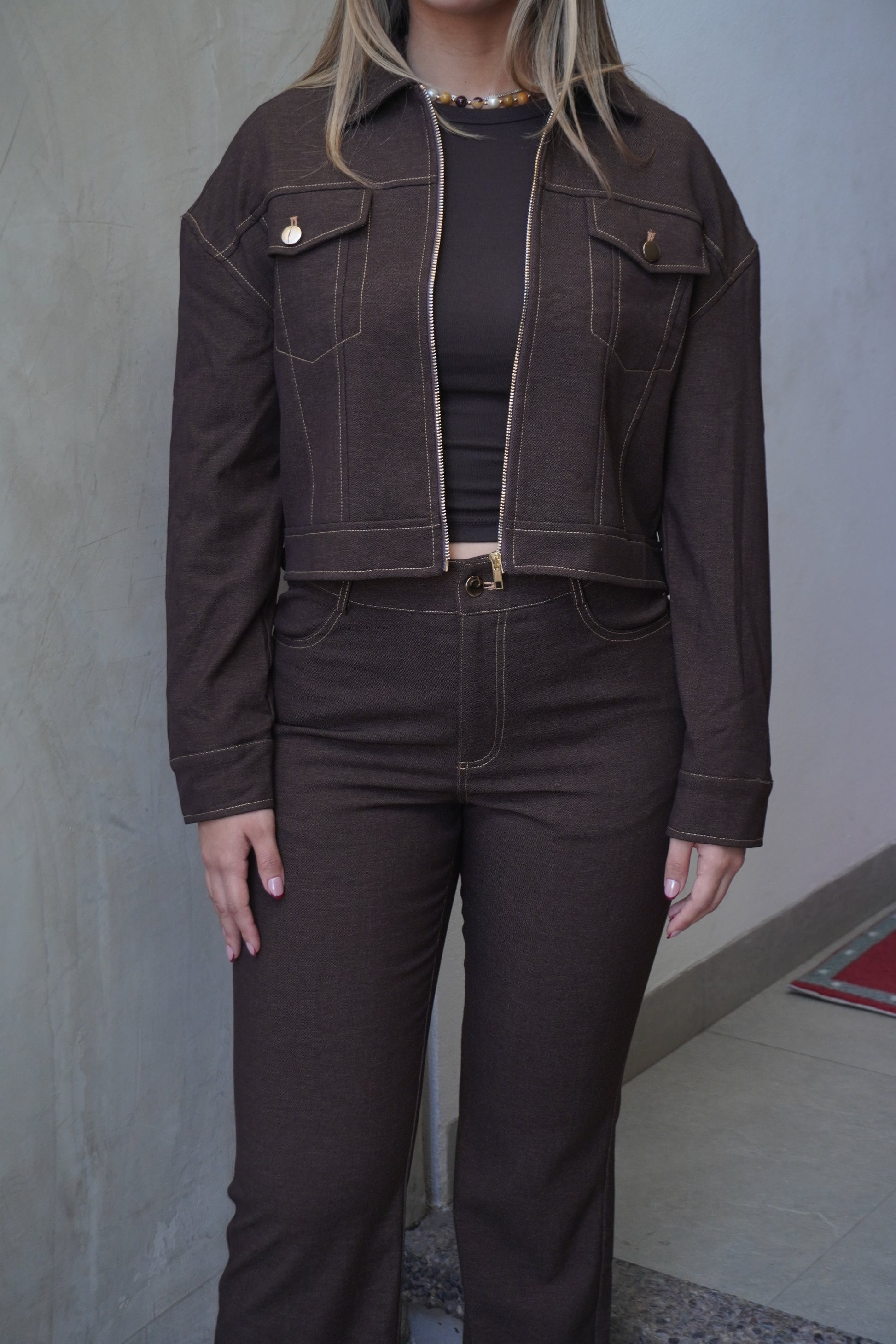 Conjunto de dos piezas en tono cocoa con diseño estructurado. Chamarra con cierre frontal y costuras visibles; pantalón de tiro alto con caída limpia.