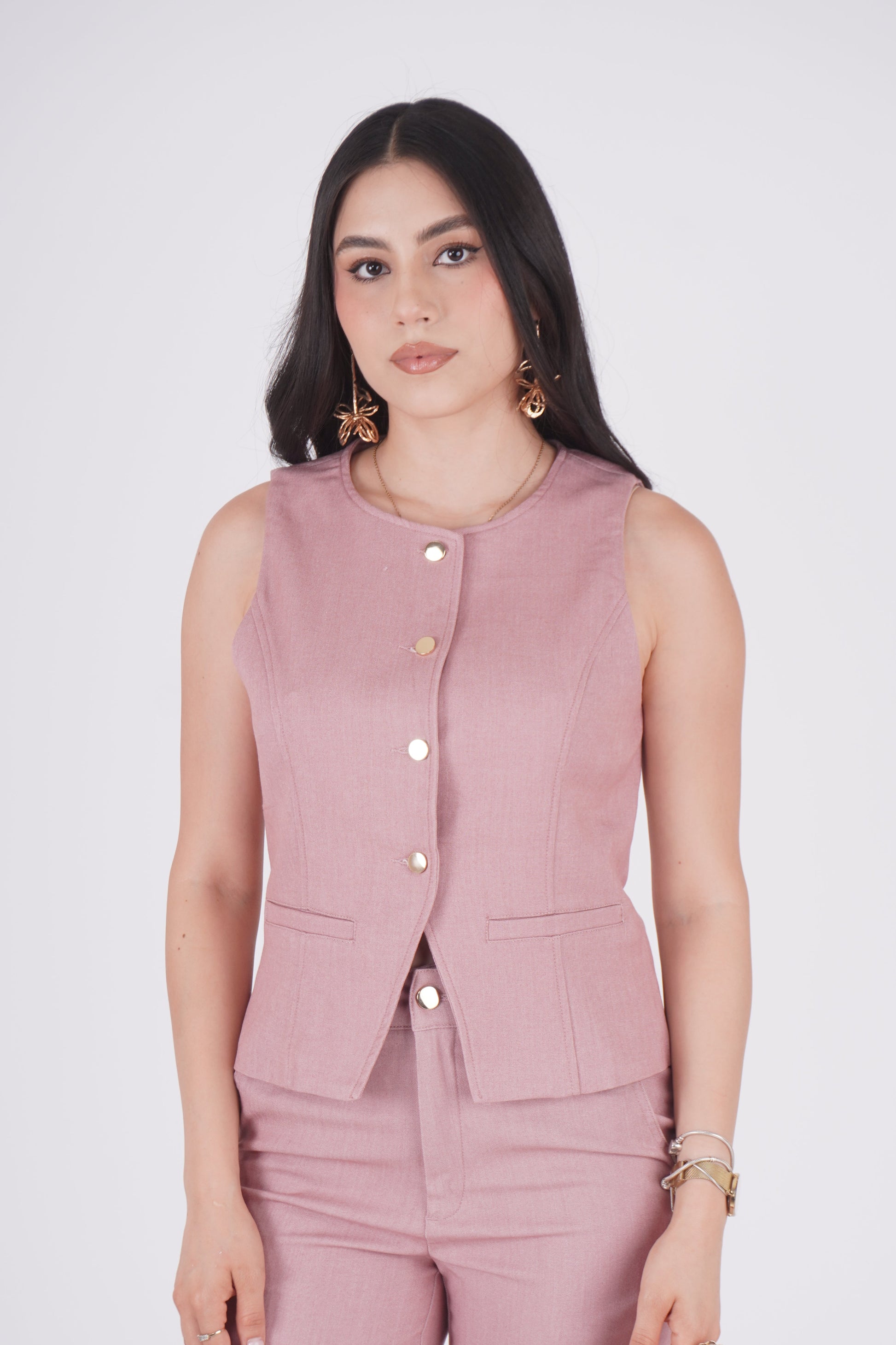 Conjunto de dos piezas confeccionado en tejido texturizado. Chaleco de cuello redondo y silueta entallada. Botones dorados en relieve. Pantalón de tiro alto y pernera ancha con una elegante caída.