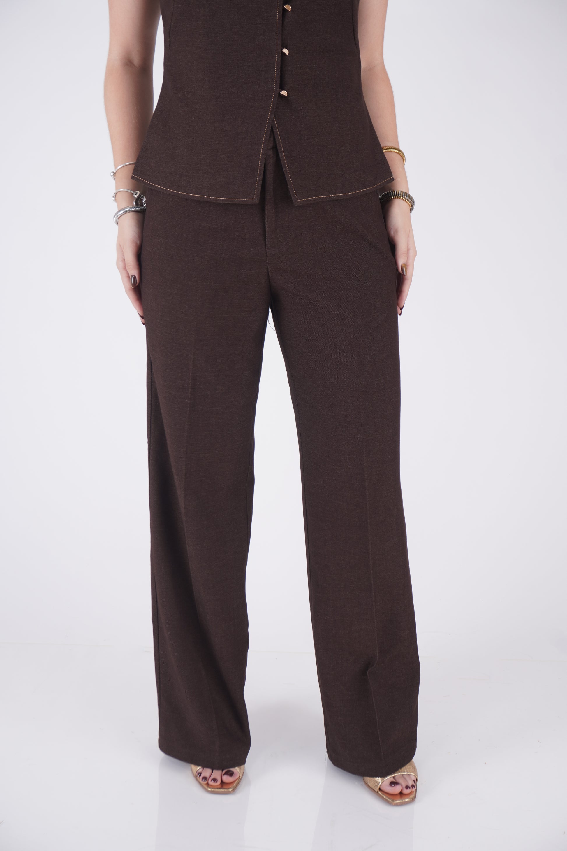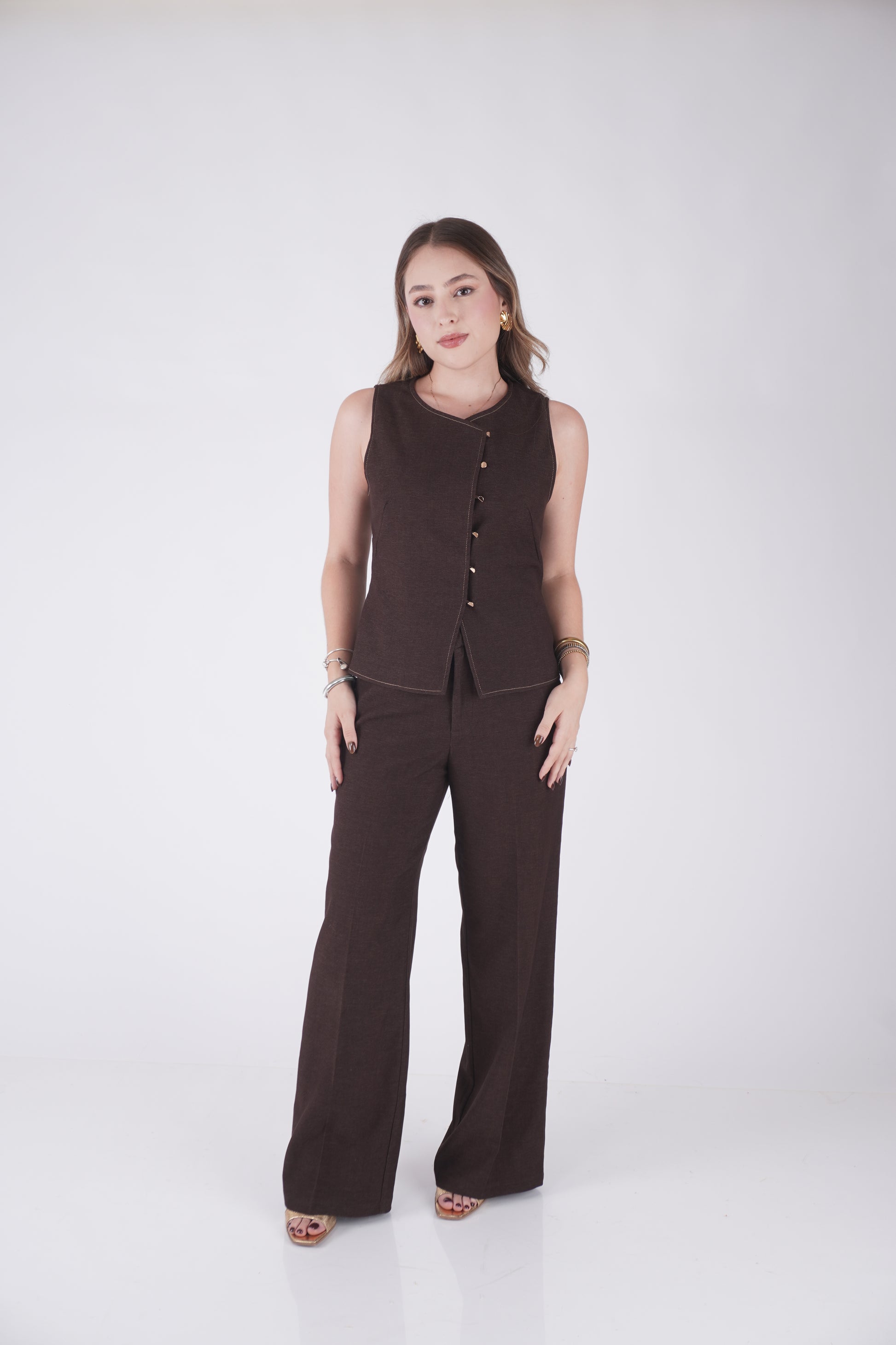 El total look perfecto. Set de dos piezas en tono cafe. Chaleco sastre sin mangas con detalle de botones asimétricos y pantalón wide leg de tiro alto.