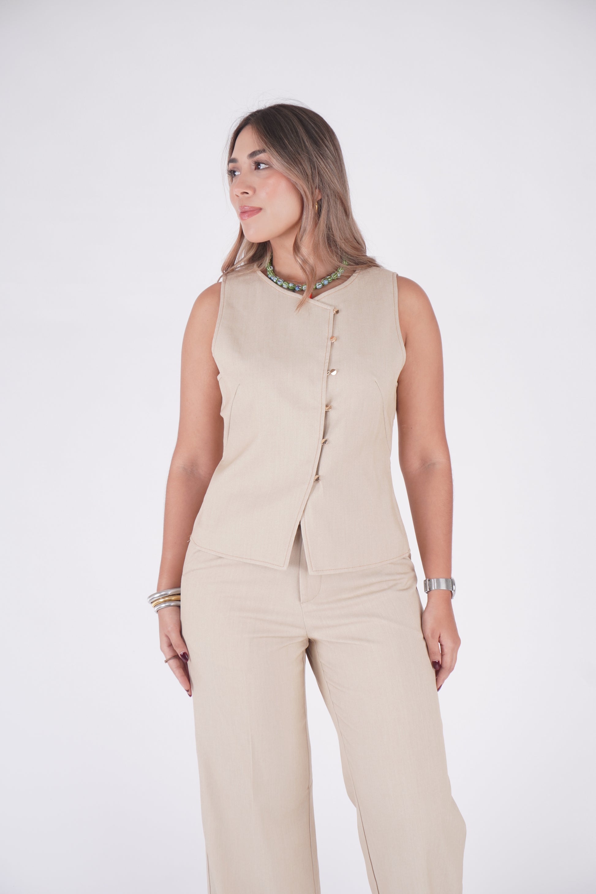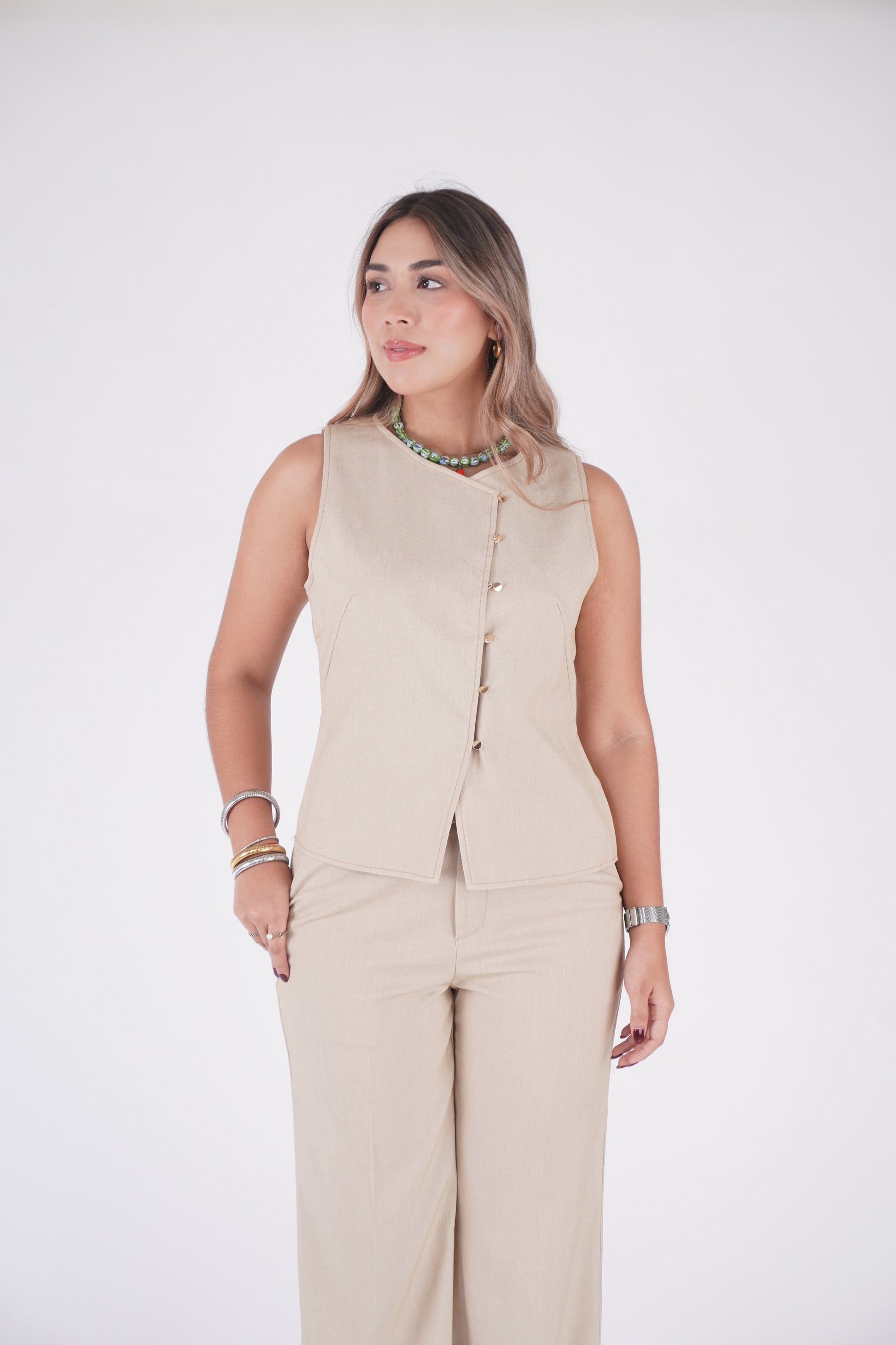 El total look perfecto. Set de dos piezas en tono neutro. Chaleco sastre sin mangas con detalle de botones asimétricos y pantalón wide leg de tiro alto.