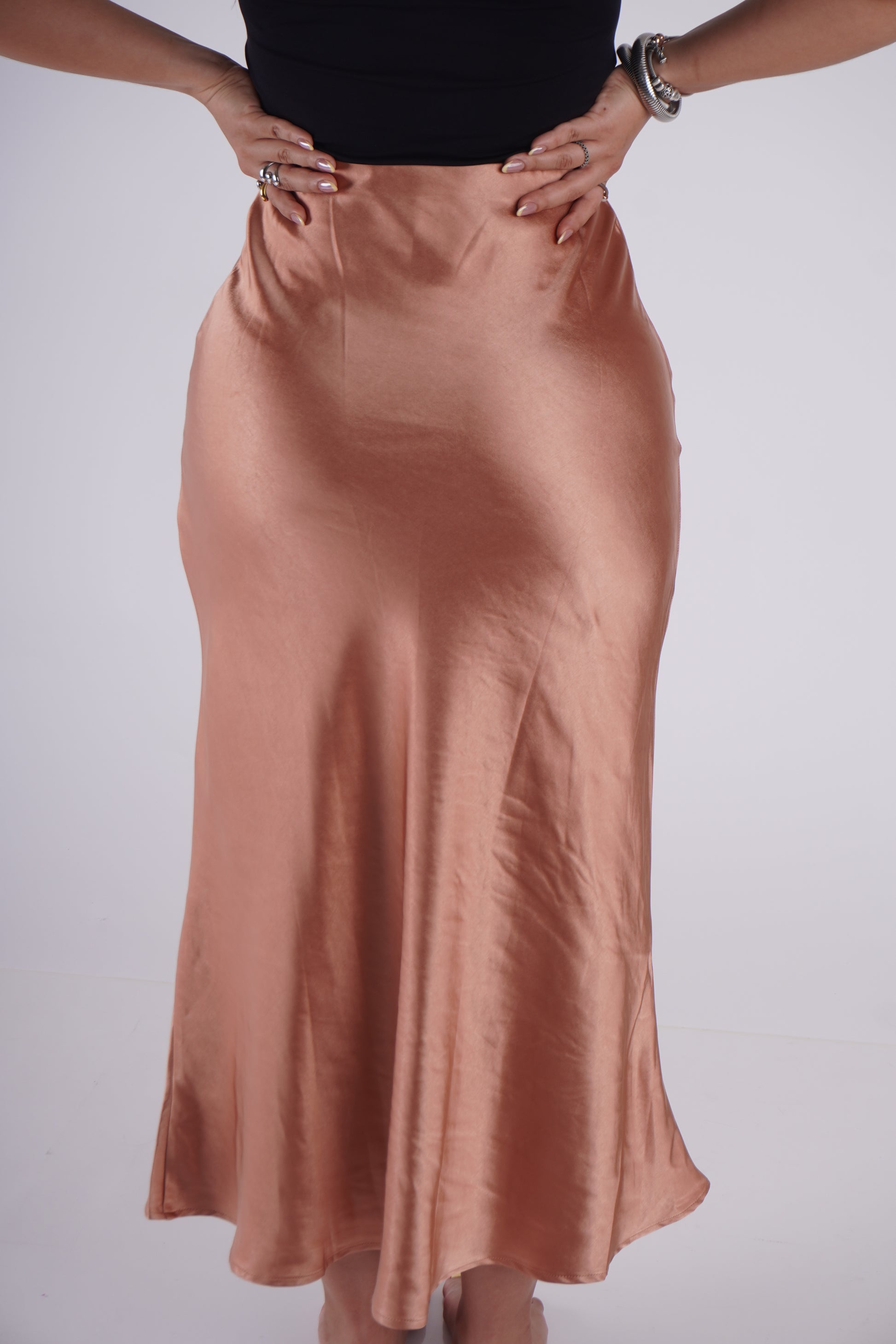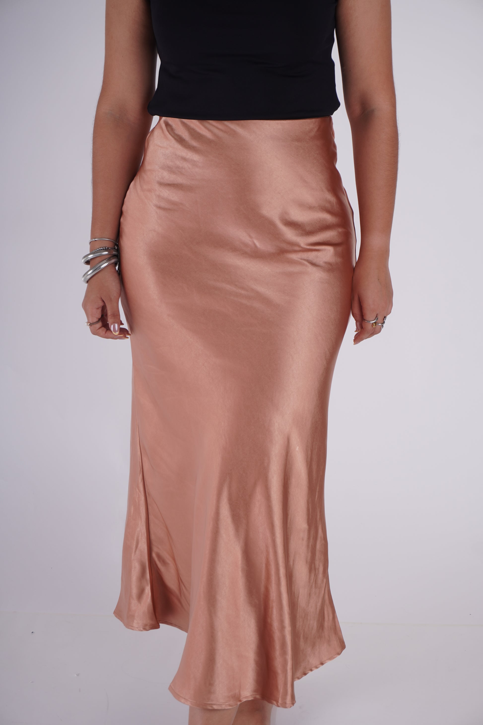 Falda midi confeccionada en tejido satinado con acabado brillante. Tiro alto y diseño fluido de línea evasé que estiliza la silueta.