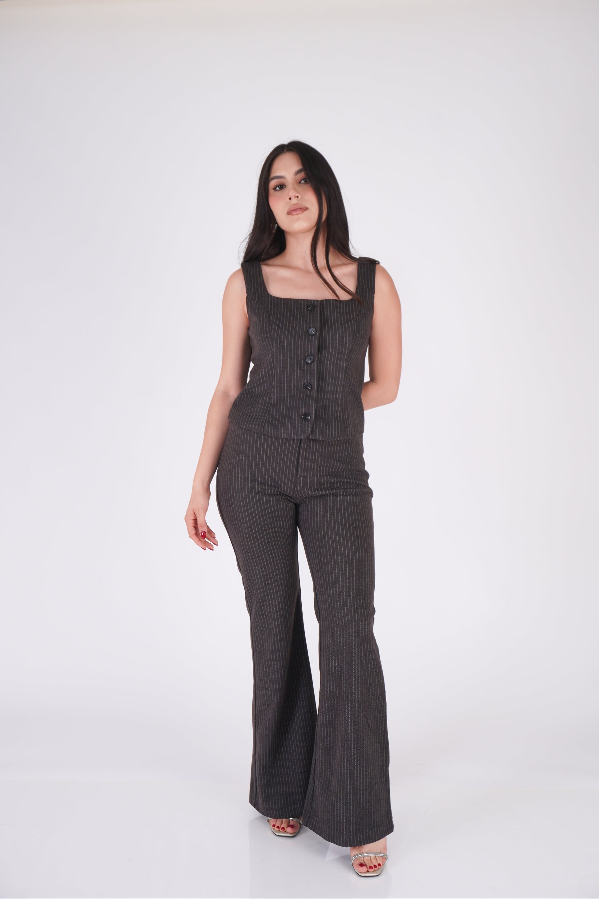 Pantalón de tiro alto, confeccionado en el mismo tejido con trama de hilo metalizado. Su silueta es ajustada en la cadera y el muslo, y termina en un bajo de corte flare. Cierre frontal con cremallera, botón interior y gancho.