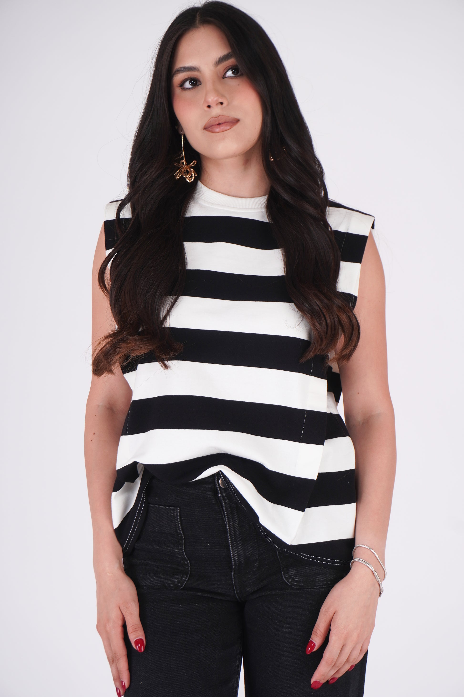 Top de cuello redondo y manga sisa confeccionado en un agradable tejido de punto. Presenta un diseño de corte recto con estampado de rayas anchas a contraste. La silueta se caracteriza por el detalle de hombreras marcadas que aportan estructura a la prenda.